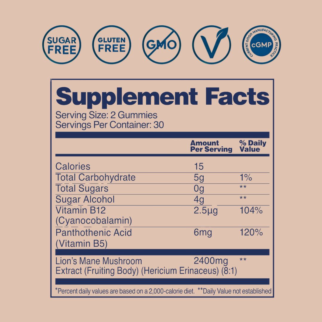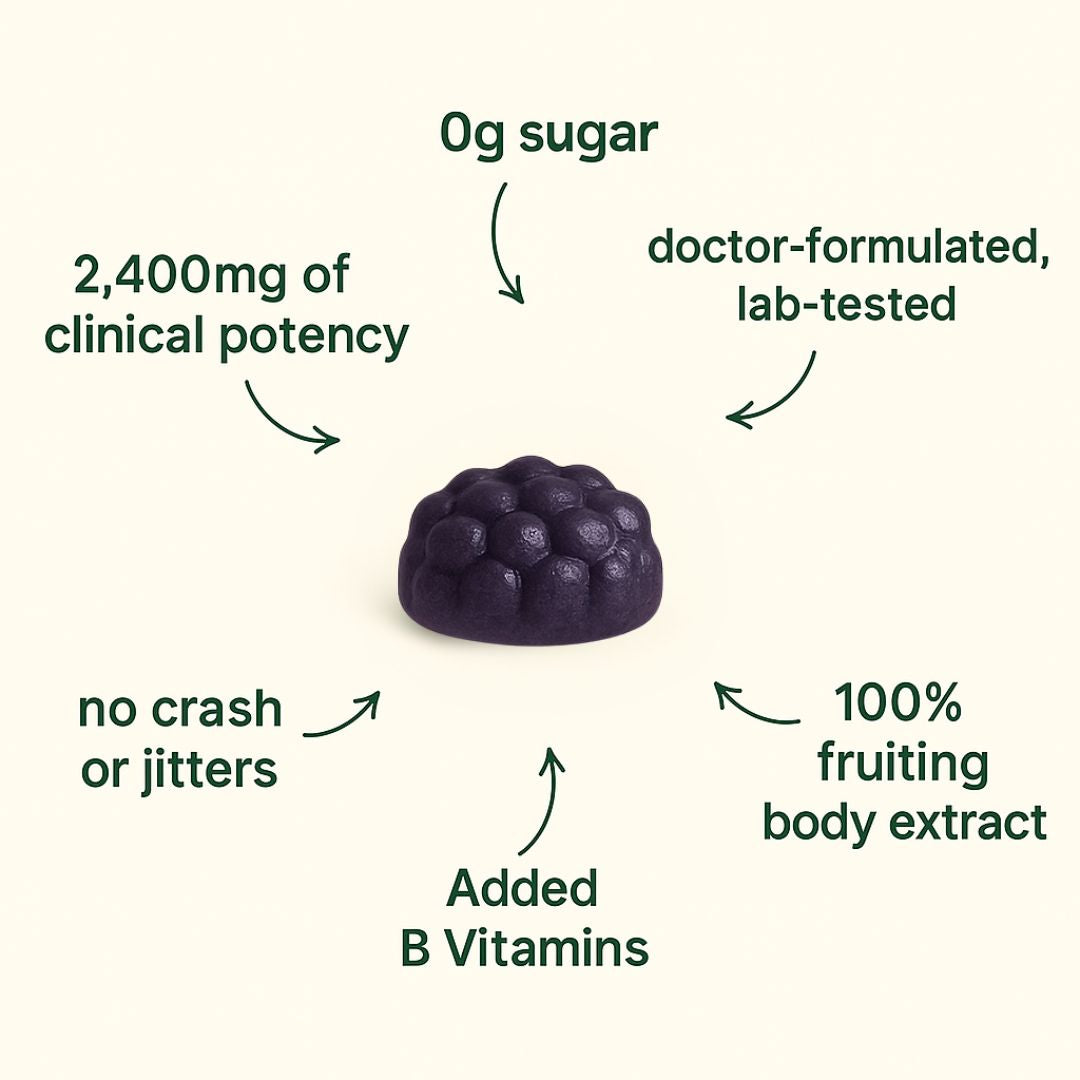 🍎 Focus Gummies — Zero-sugar apple flavored Lion's Mane gummies with B5 + B12 to support focus, memory, and mental clarity. Clean fuel for your mind, backed by science.