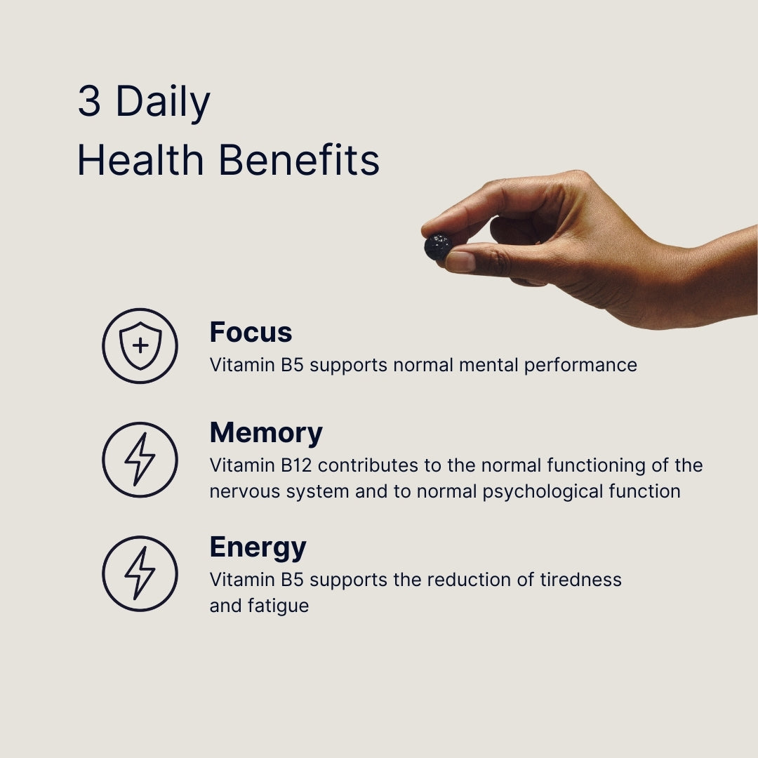 Packed with 2,400mg of Lion’s Mane and 100% of your daily recommended intake of Vitamins B12 and B5, offering powerful support for cognitive function and memory while helping to reduce tiredness and fatigue.